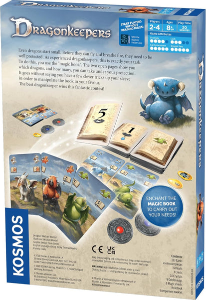 In Dragonkeepers, you compete against each other as magicians. Two stacks of cards form the "Magic Book", which indicates which and how many dragons can be herded. With each card taken, this information changes, but luckily you can cast spells and return your cards to the Magic Book to change it in your favor and score! But which of your dragons can you spare to cast spells?