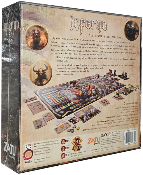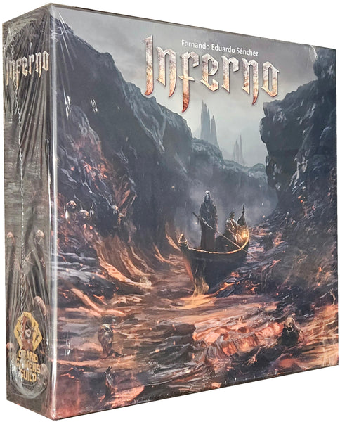 Inferno is a soul management game where each player must guide sinners to their respective circles in Hell. The central board consists of two parts: one displaying all 9 circles and the soul registry, while the other represents Florence in the early 14th century, where Dante lived, with its power games and palace intrigues.