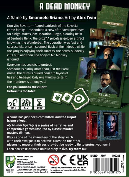 In My Murder Mystery: A Dead Monkey, Don Vito Sovetta, feared patriarch of the Sovetta crime family, has assembled a crew of trusted operatives for a high-stakes job: "Operation Jungle", a daring heist at Centralia Bank.