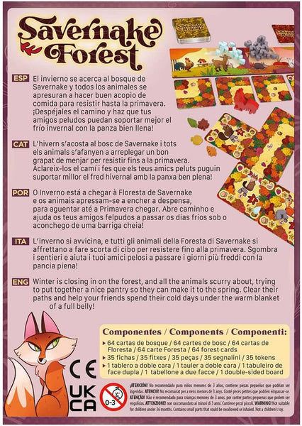 Foxes, hedgehogs, beavers, owls, rabbits, woodpeckers, wild cats... Up to 23 different types of animals live together in the Savernake Forest. At the end of autumn, they all prepare to spend the cold winter with enough provisions and here you are to give them a hand… Or a paw! To play Savernake Forest you have two decks of square cards, one showing the animals and the other with forest paths full of succulent food. Each player is randomly given an animal card, showing how many foods they can store and their preferences. For example, the fox loves eggs, but not berries or nuts. To get the best score, you must try to get each animal to collect its favorite foods.
