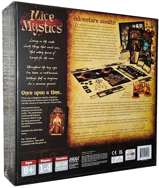Mice and Mystics is a cooperative adventure game in which the players work together to save an imperiled kingdom. They will face countless adversaries such as rats, cockroaches, and spiders, and of course the greatest of all horrors: the castle's housecat, Brodie. Mice and Mystics is a boldly innovative game that thrusts players into an ever-changing, interactive environment, and features a rich storyline that the players help create as they play the game. The Cheese System allows players to hoard the crumbs of precious cheese they find on their journey, and use it to bolster their mice with grandiose new abilities and overcome seemingly insurmountable odds.
