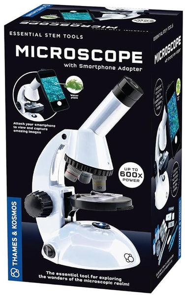 Discover wonders that are too small to see with the naked eye! This high-quality student microscope comes with all the tools and accessories you need on your journey into the invisible world around us Start by viewing three prepared slides to learn how this classic tool works. Then, use the 45-piece accessory set to prepare your own collected specimens. The universal smartphone adapter lets you use your smartphone camera to capture photos and videos of your observations to document and share. The microscope's 15x ocular lens, or eyepiece lens, works together with the three objective lenses, resulting in a total magnification power of 60x, 150x, or 600x. The precision adjustment knob, stable base, and long-lasting, battery-powered LED light all work to create a clear, crisp image. The kit includes slides, cover slips, and many other tools for collecting and preparing samples. The instruction manual guides you through using the microscope and the tools to help you get the most out of your equipment, What will you discover?