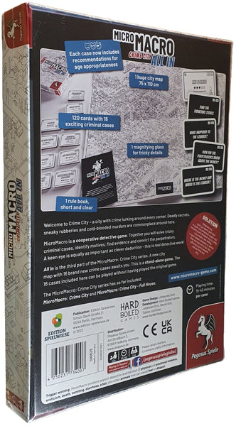 With MicroMacro: Crime City – All In, the next district of the crime-ridden black-and-white metropolis Crime City now opens up for the players. On a new, huge city map, which seamlessly follows the previous plans, 16 tricky crime cases are again waiting to be solved by one to four amateur detectives. These are brand new stories, more sophisticated and criminal than ever before! The aim is to determine motives, find evidence and convict the perpetrators. An attentive eye is just as much in demand as creative powers of deduction to unravel everything on the 75 x 110 cm game board. As a little help, a magnifying glass is included in the game and the individual cases are again marked with symbols, so that parents can decide which cases even the youngest investigators may investigate and uncover. MicroMacro: Crime City 3 - All In can be played completely independently, no previous knowledge from the other two parts is required.